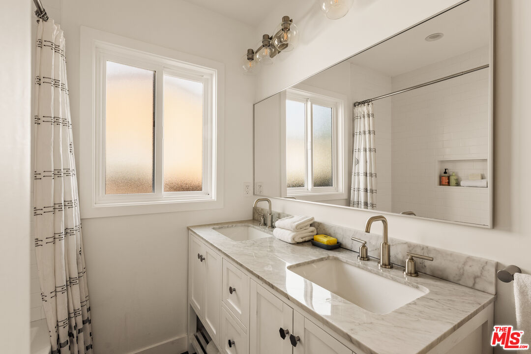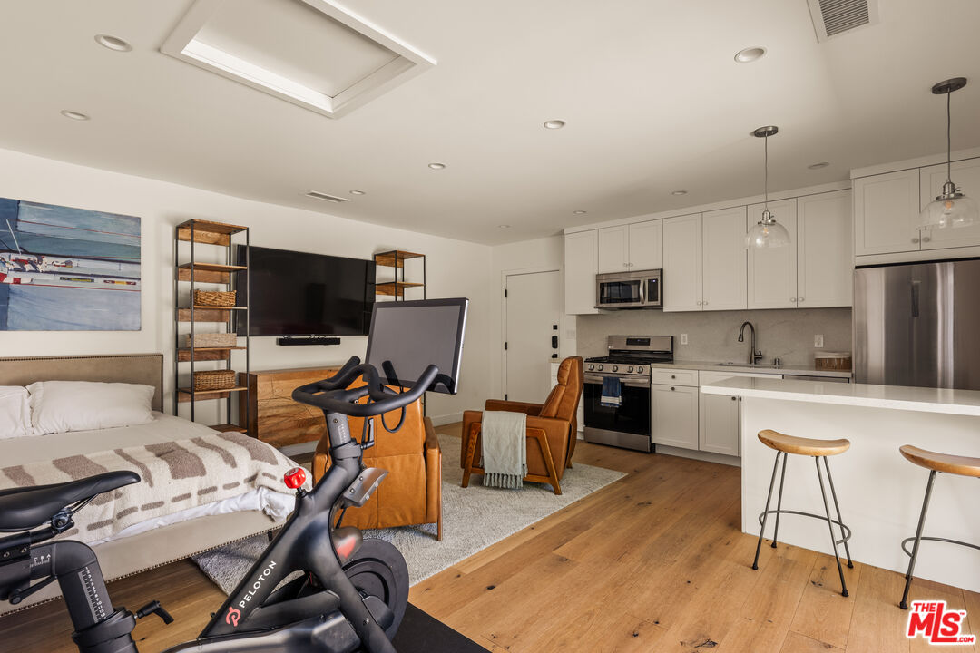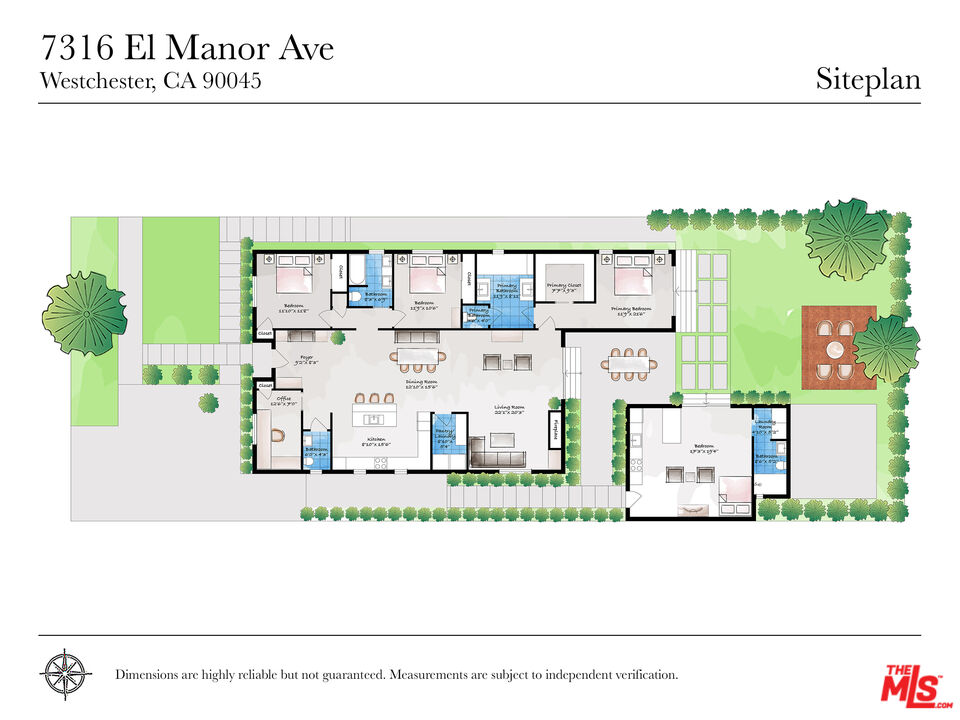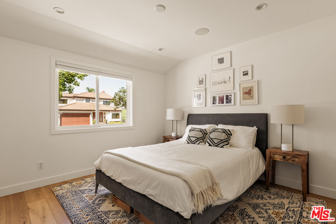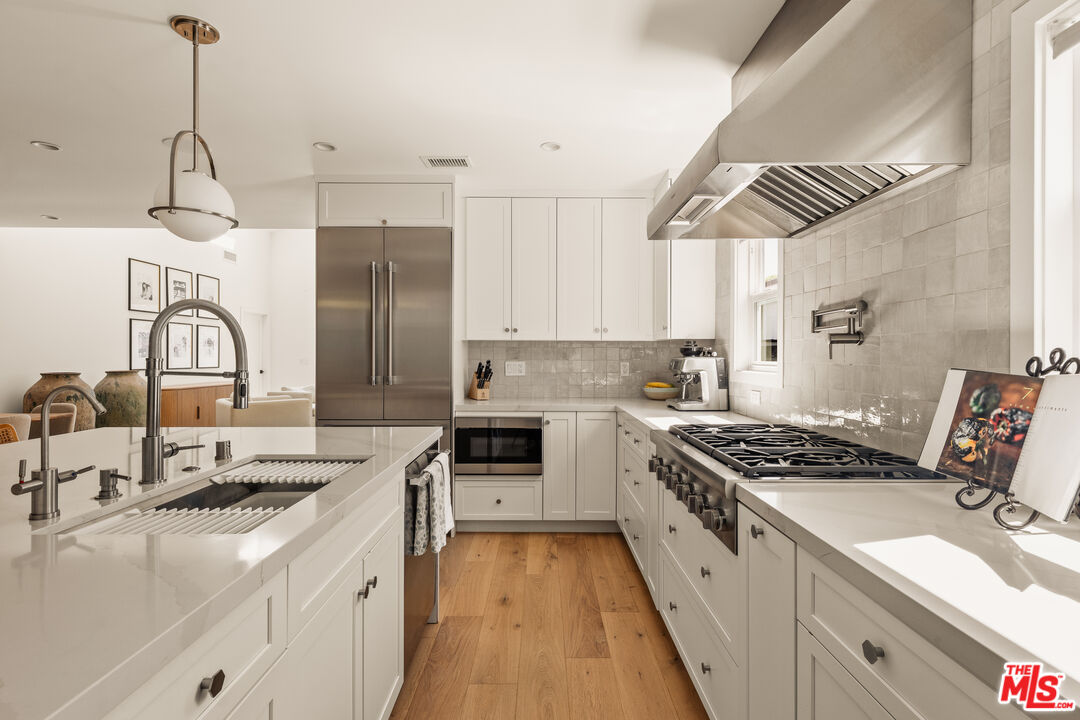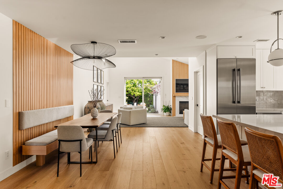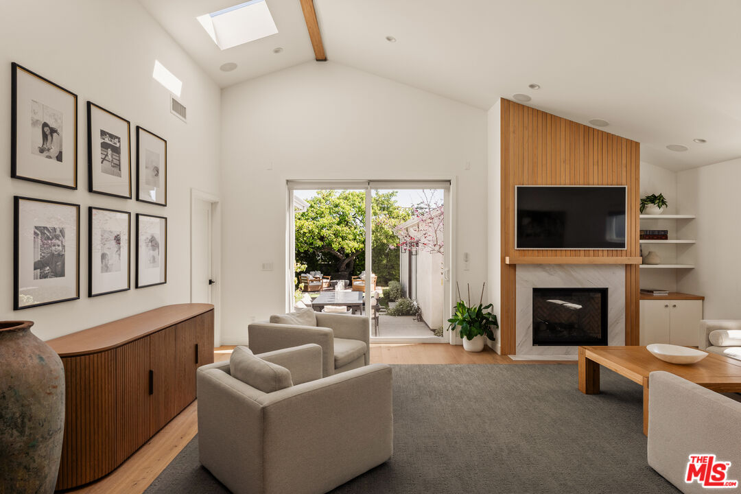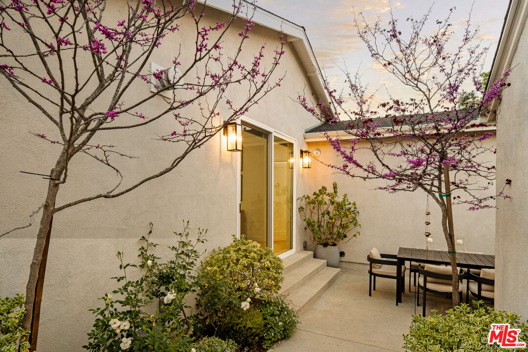 Tucked within the most coveted pocket of Upper North Kentwood, this truly one-of-a-kind residence offers a rare blend of inspired design, modern luxury, and exceptional versatility. Fully renovated and thoughtfully reimagined just a few years ago, this 4-bedroom, 2.5-bathroom home plus a studio ADU presents an extraordinary opportunity in one of the Westside's most sought-after neighborhoods. A pristinely manicured, landscaped front yard sets a refined first impression, guiding you along a charming path to the welcoming Dutch door entry. Inside, a custom built-in bench creates an elegant and functional foyer moment before the home opens into an expansive, light-filled floor plan. Wide white oak flooring flows seamlessly throughout, enhancing the home's warmth and cohesion. Walls of glass draw the outdoors in, extending the living experience effortlessly to the private backyard beyond. Designed for both daily living and elevated entertaining, the chef's kitchen stands as the heart of the home. Outfitted with a Thermador double oven, a six-burner range with pot filler, and a generous center island with breakfast counter, this space balances performance with beauty. A full-size pantry and utility closet ensure exceptional functionality, while the adjacent dining area, framed by a striking wood-paneled accent wall, overlooks the inviting living room. Grand in scale, the living room features vaulted ceilings with skylights that bathe the space in natural light. A gas fireplace with built-in shelving anchors the room, while glass doors open directly to the dining patio and lush backyard, creating effortless indoor-outdoor flow. The outdoor retreat offers complete privacy, enveloped by mature trees, lush hedging, and thoughtfully curated garden beds. A spacious dining patio transitions to a grassy yard, ideal for alfresco gatherings or tranquil mornings in the sun. Back inside, the primary suite serves as a serene sanctuary, complete with vaulted ceilings, a walk-in closet, and a spa-inspired ensuite featuring a steam shower. Three additional bedrooms, a full bathroom, and a powder room provide comfort and flexibility for family and guests. Modern living is elevated in this fully integrated smart home featuring automated lighting, built-in indoor and outdoor speakers, wi-fi inside and out, camera monitoring systems and 220V wiring at the driveway for EV Charging. The detached ADU enhances the property's versatility with its own kitchen and breakfast counter, walk-in closet with laundry, and full bathroom, perfect for guests, extended family, or income potential. A gated driveway ensures added privacy and security, while accommodating four or more parking spaces with ease. This exceptional Upper North Kentwood offering captures the essence of refined California living, private, polished, and truly unforgettable.