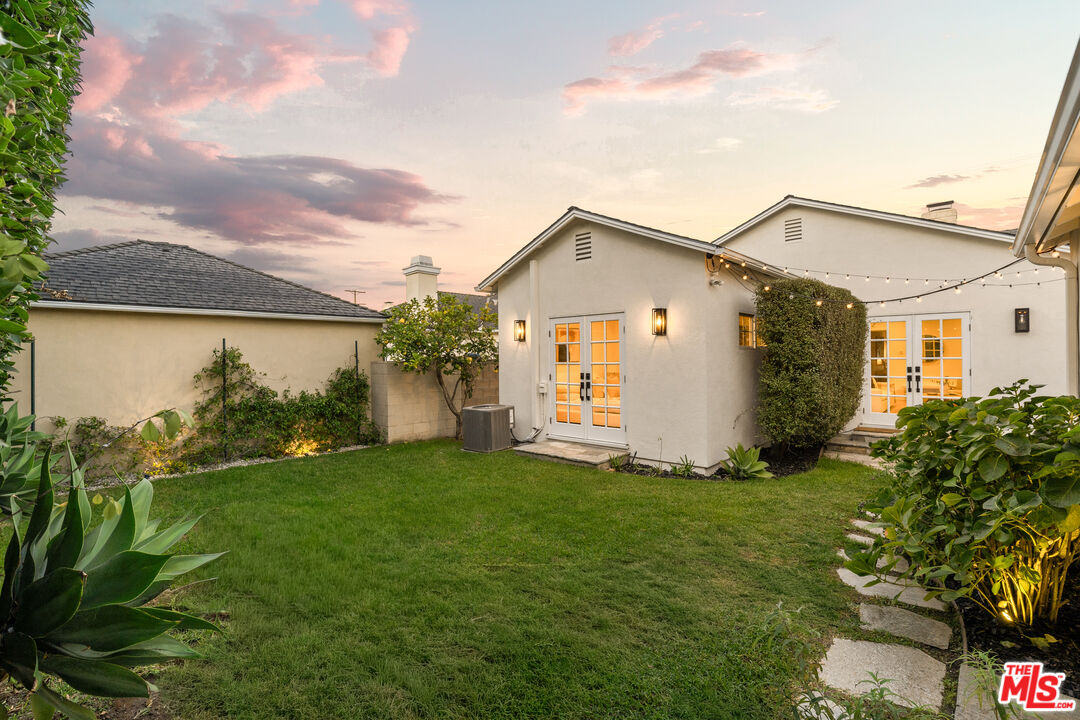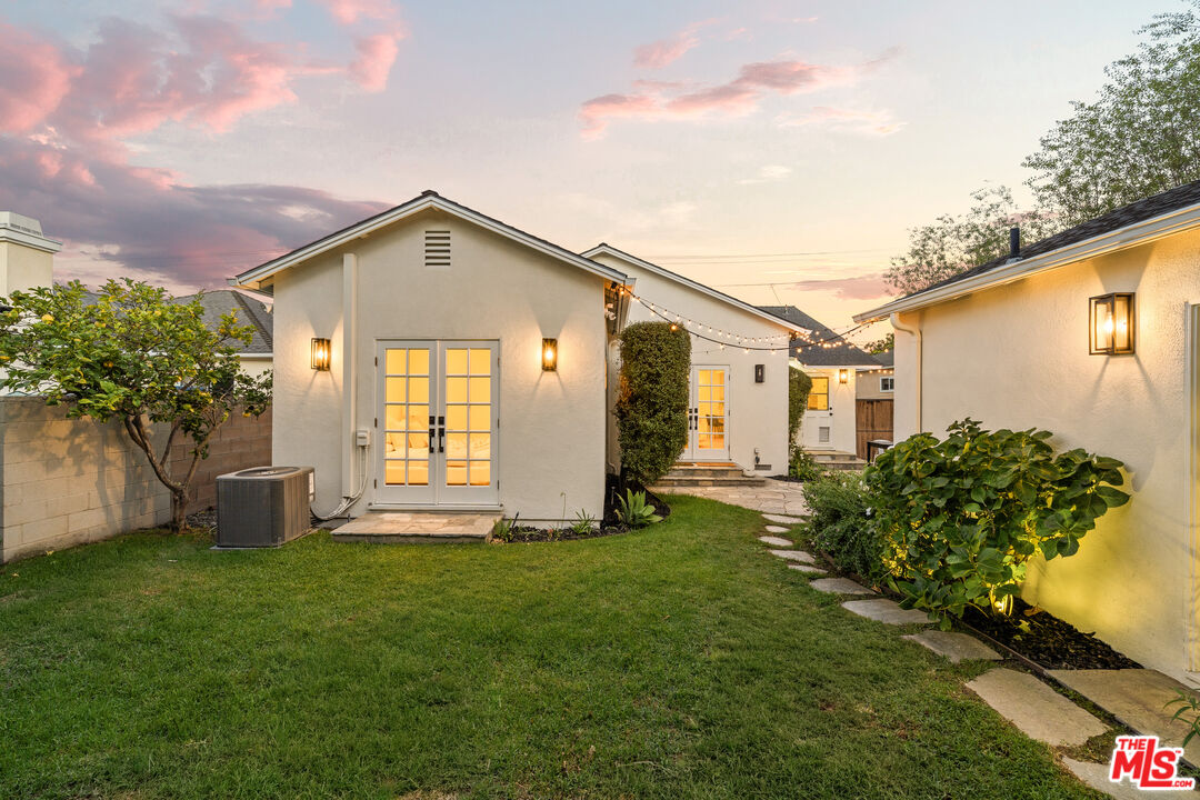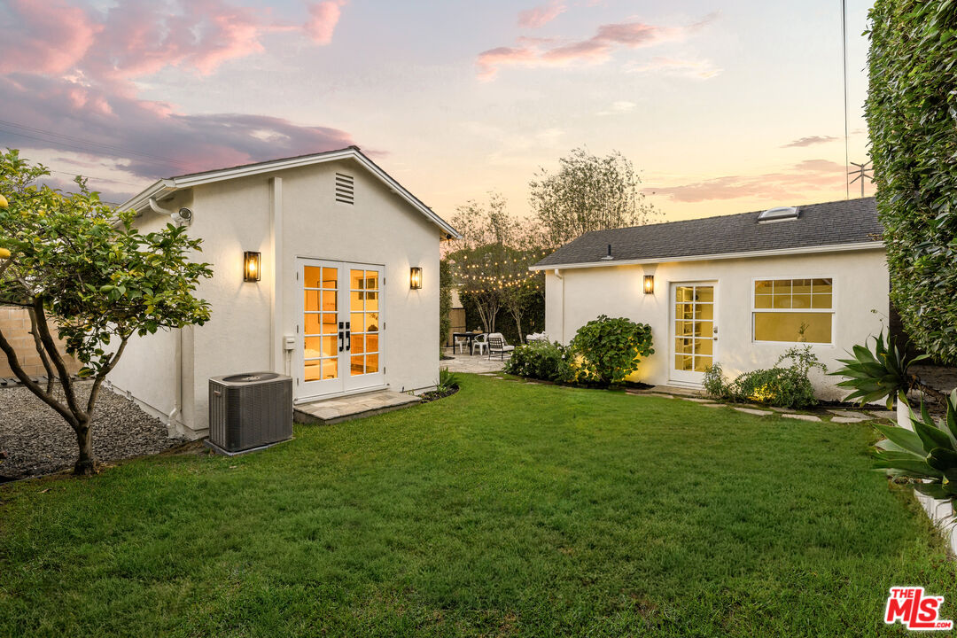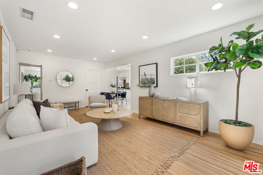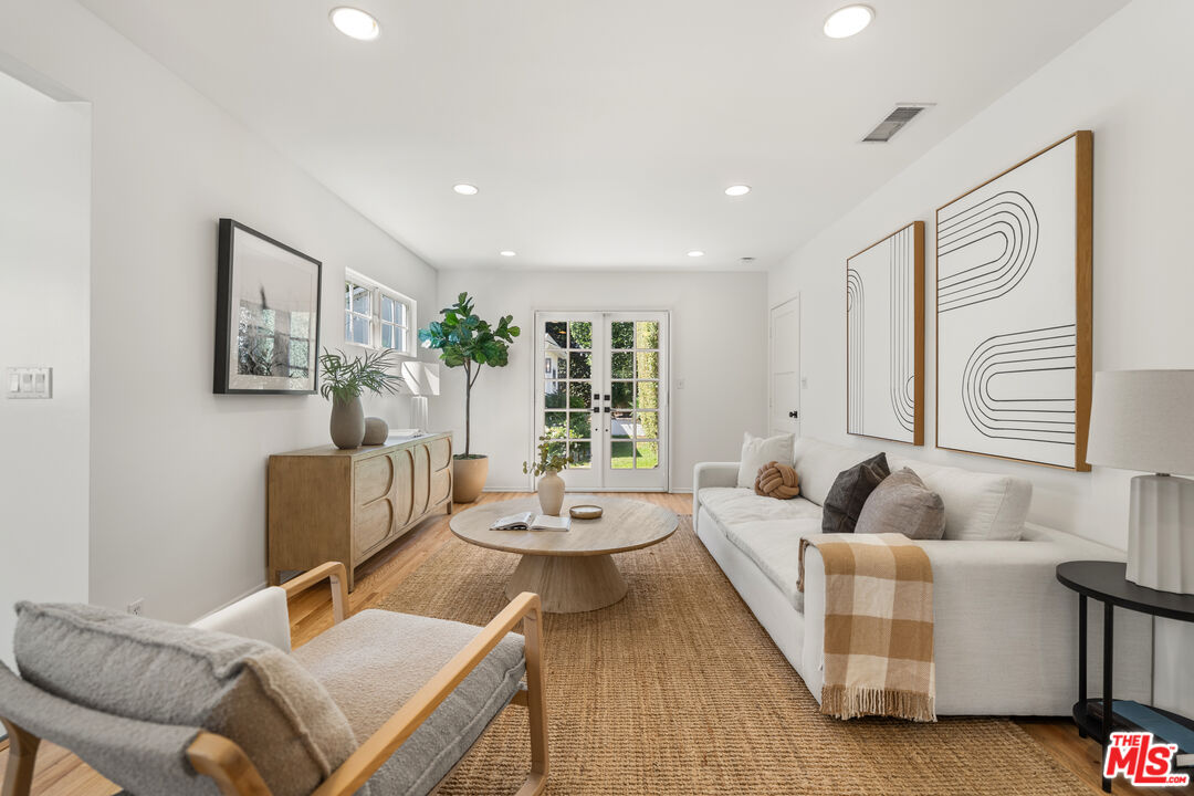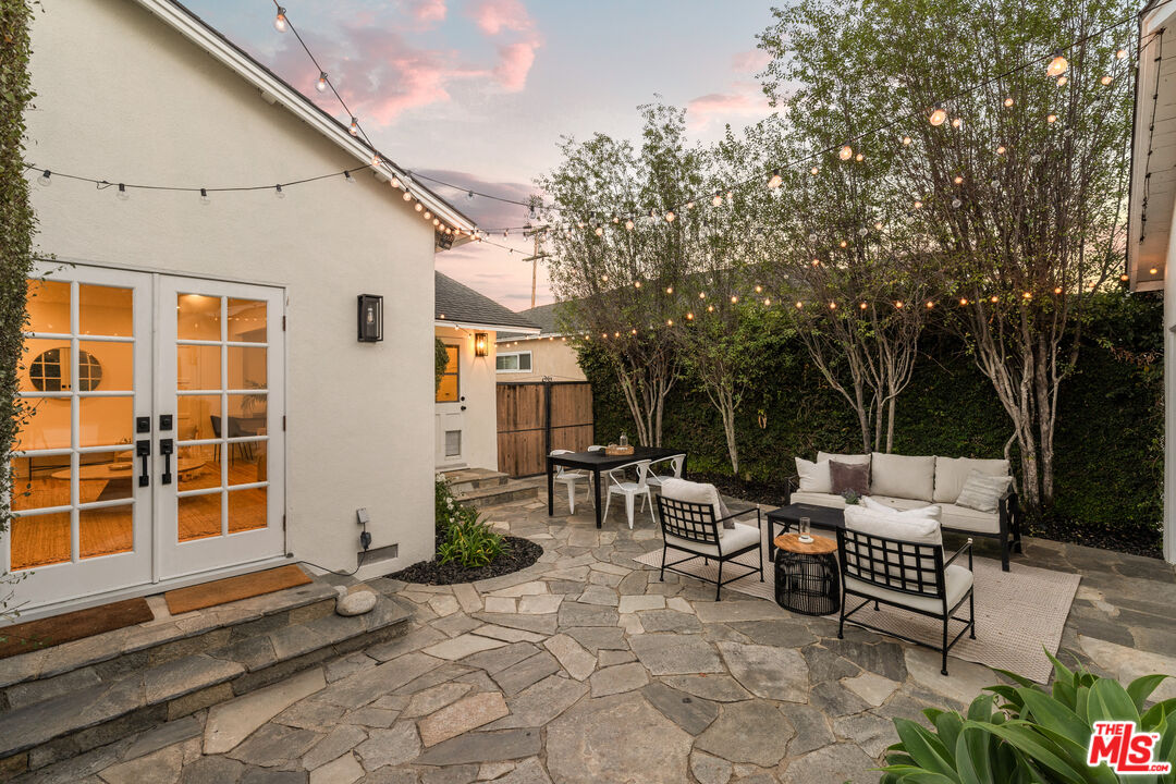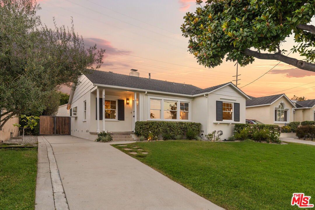Located on one of North Kentwood's premier streets, this light-filled single-level home with three bedrooms and two bathrooms blends timeless charm with modern updates. A formal living room with a classic brick fireplace flows into an adjacent dining room, while the chef's kitchen with breakfast nook and stainless steel appliances opens to a spacious family room with French doors leading to a private backyard that backs to Loyola Marymount University and is lined with tall trees for added privacy. The serene primary suite sits at the rear of the home and features French doors with direct access to the backyard, a walk-in closet, and a spa-like bath with dual sinks, skylight, and oversized shower. Two secondary bedrooms at the front of the home are served by the original hallway bath. Additional highlights include beautifully refinished original hardwood floors, freshly painted interior and exterior, central heating and A/C, gated driveway, and bright, airy rooms throughout. A detached two-car garage offers a versatile flex space with half bath, ideal for a home office, studio, or gym.