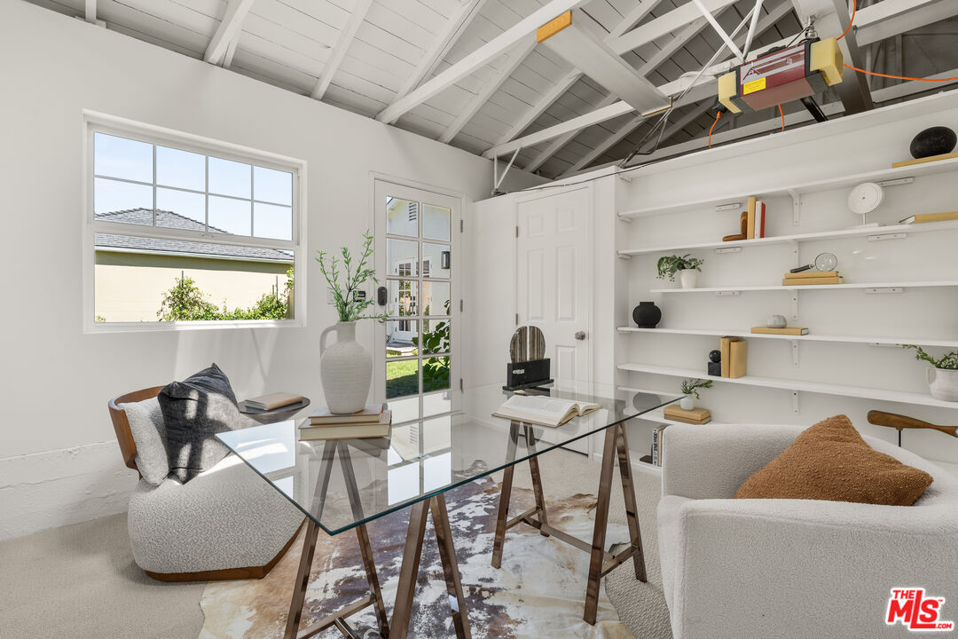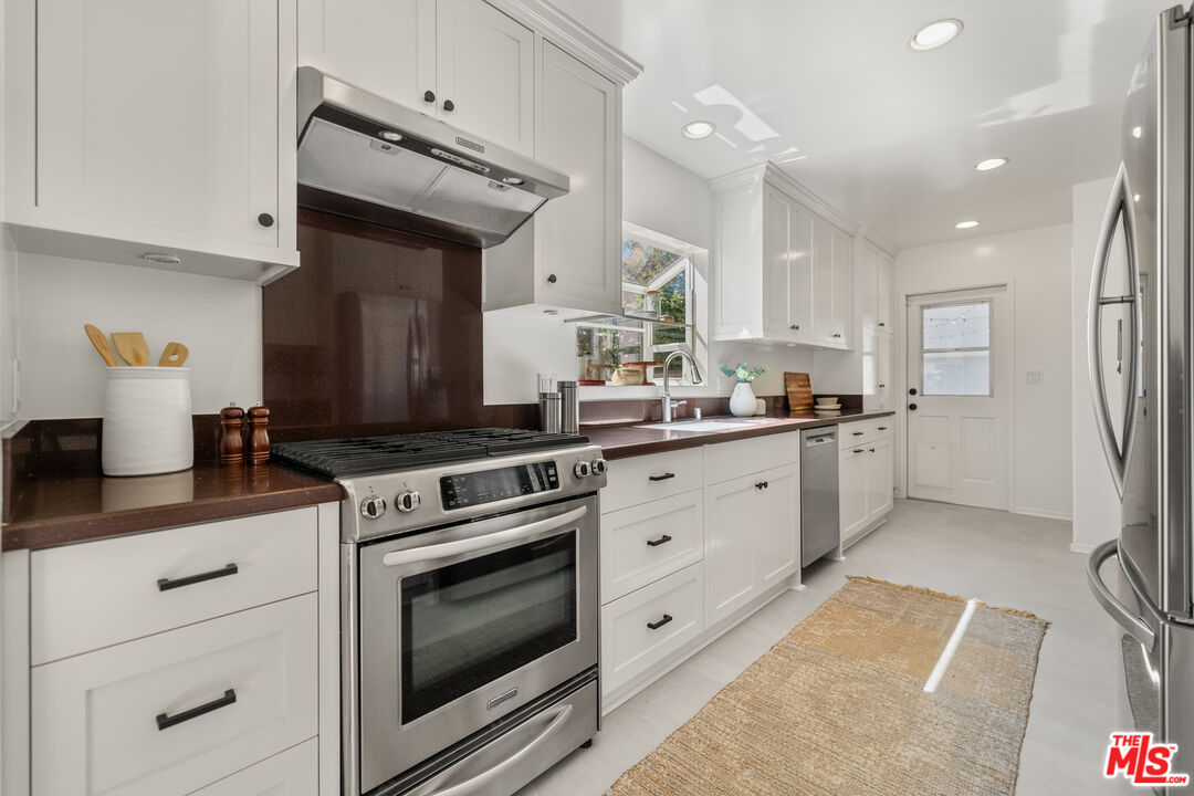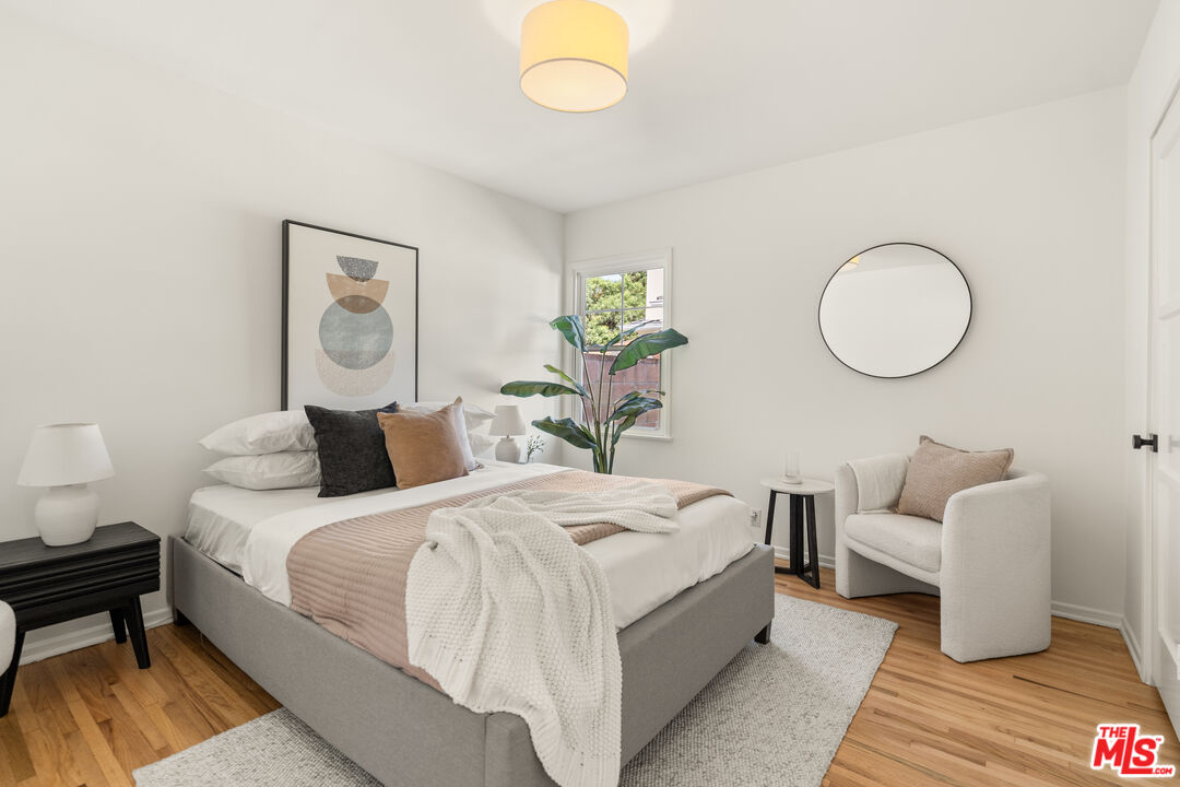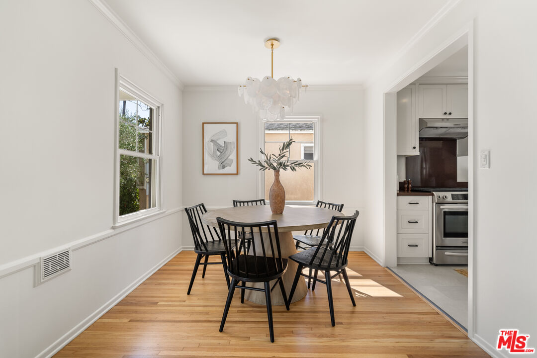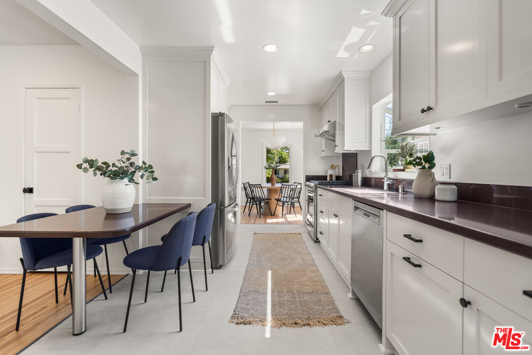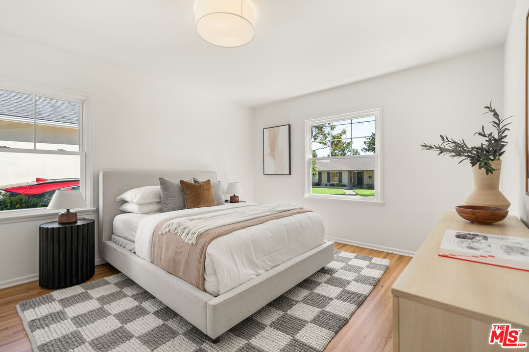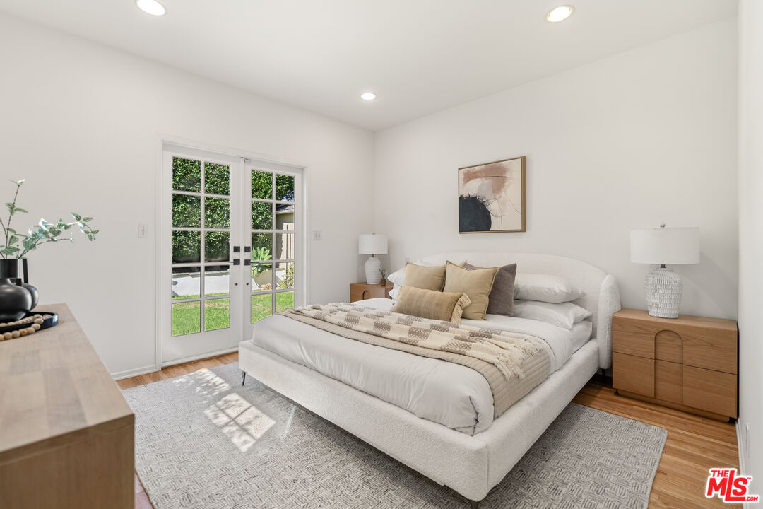 Located on one of North Kentwood's premier streets, this light-filled single-level home with three bedrooms and two bathrooms blends timeless charm with modern updates. A formal living room with a classic brick fireplace flows into an adjacent dining room, while the chef's kitchen with breakfast nook and stainless steel appliances opens to a spacious family room with French doors leading to a private backyard that backs to Loyola Marymount University and is lined with tall trees for added privacy. The serene primary suite sits at the rear of the home and features French doors with direct access to the backyard, a walk-in closet, and a spa-like bath with dual sinks, skylight, and oversized shower. Two secondary bedrooms at the front of the home are served by the original hallway bath. Additional highlights include beautifully refinished original hardwood floors, freshly painted interior and exterior, central heating and A/C, gated driveway, and bright, airy rooms throughout. A detached two-car garage offers a versatile flex space with half bath, ideal for a home office, studio, or gym.