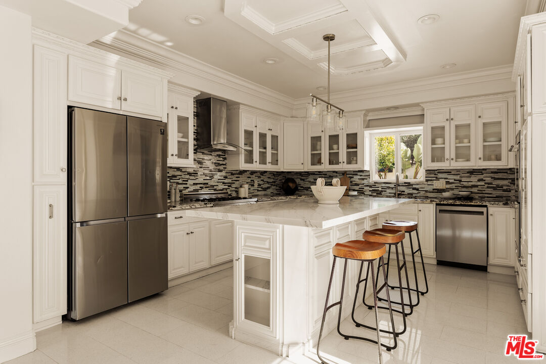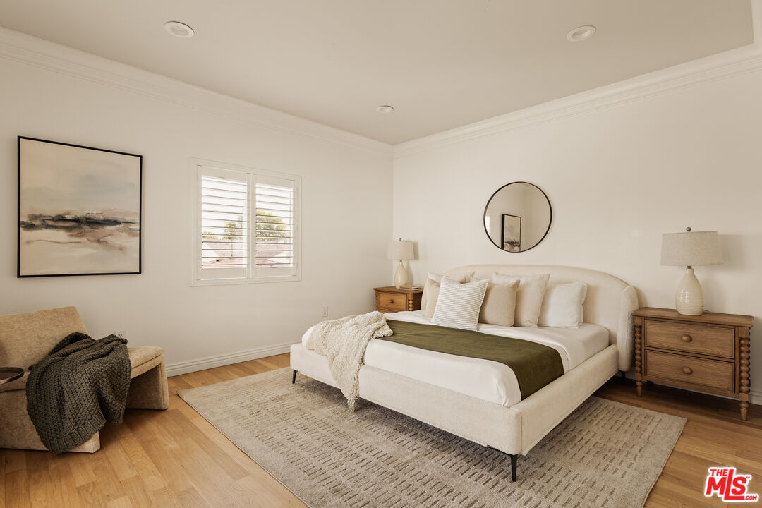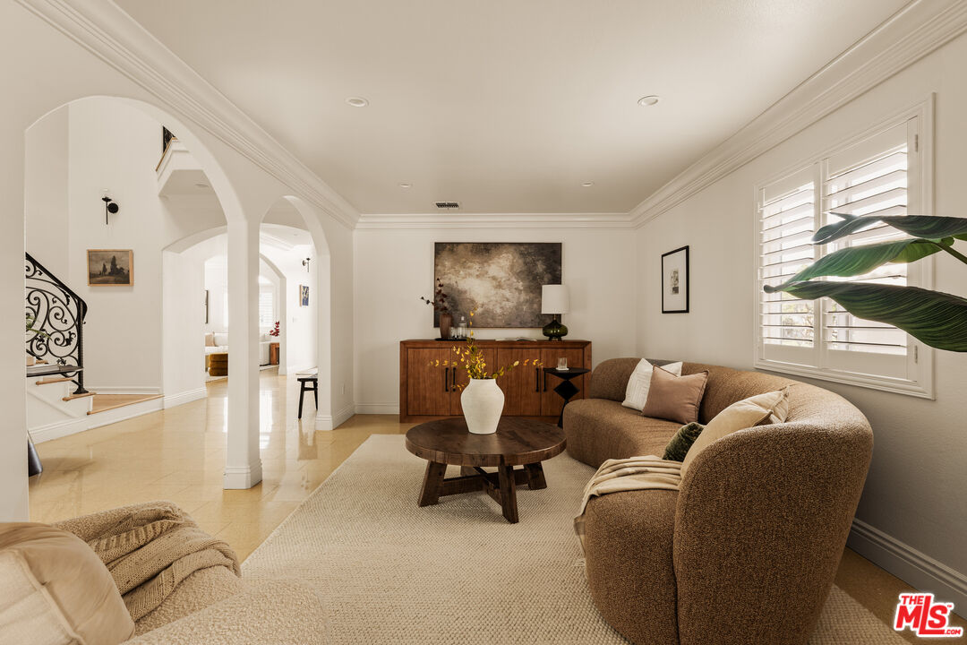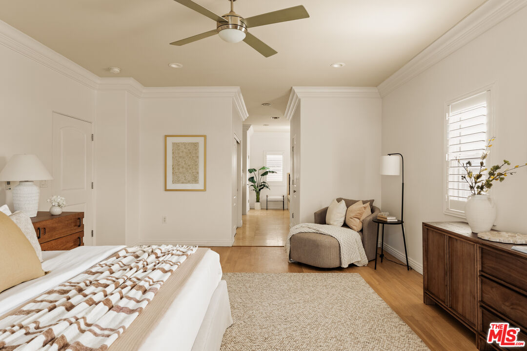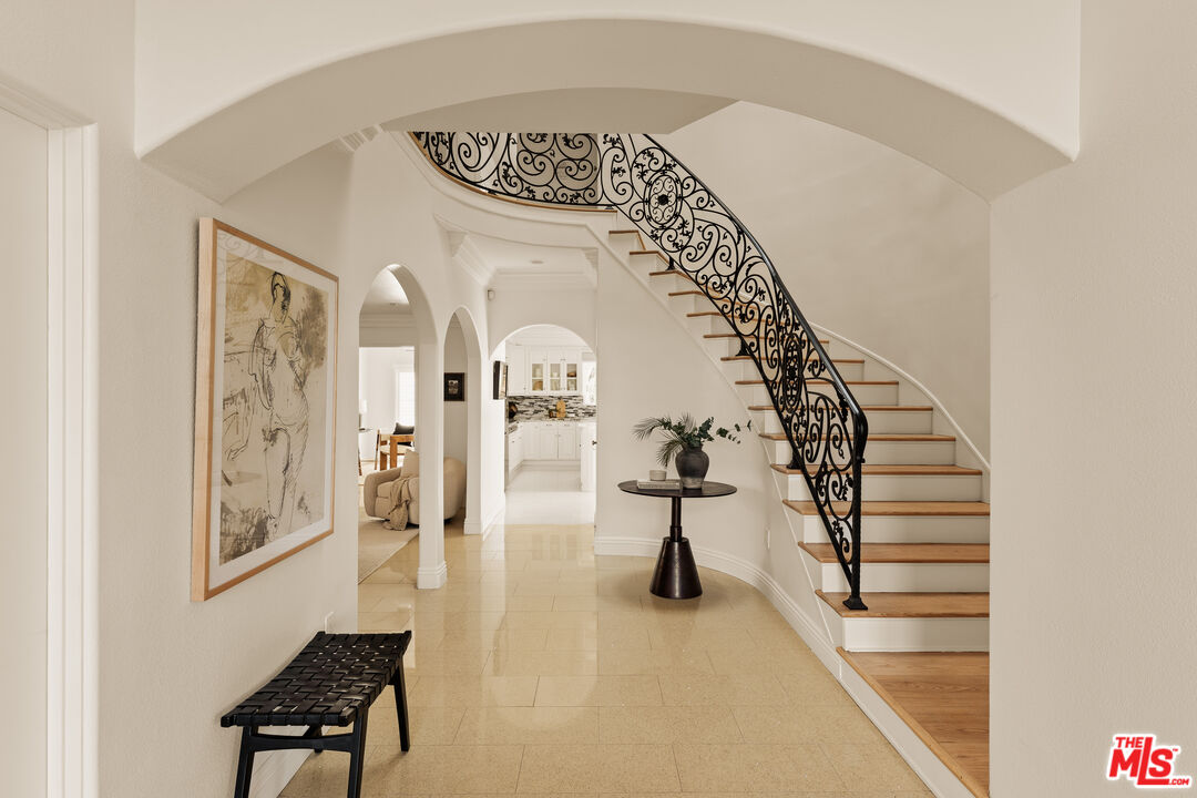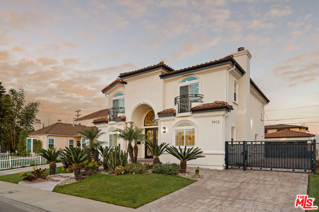 Private and gated, this stunning Mediterranean residence welcomes you through an ornate wrought-iron double-door entry, setting the tone for the elegance that unfolds within. Crisp white walls, soaring ceilings, and an abundance of natural light create an immediate sense of calm as you step into the grand two-story foyer. From there, the thoughtfully designed main level opens to a gracious living room, family room, formal dining room, and kitchen, each space offering both scale and sophistication for everyday living and entertaining. The chef's kitchen is sure to impress, featuring stainless steel appliances, a classic tile backsplash, a new quartz island countertop, and a convenient secondary exit to the backyard, making indoor/outdoor entertaining seamless. Sliding glass doors lead to a beautifully designed outdoor space with a generous deck ideal for al fresco dining, lush lawn for play, raised garden beds for the green thumb, and additional built-in ample storage. On the main level, you'll find two spacious rooms and a full bath, all wheelchair accessible, perfect for multigenerational living. One of these rooms is currently used as a home office but can easily function as a fifth bedroom, offering flexibility to suit your lifestyle. Upstairs, a charming reading nook and sitting area provides a quiet retreat before branching off to the remaining three bedrooms, including the serene primary suite. The primary is a true sanctuary, featuring elegant molding, abundant natural light, and a spa-inspired bath with natural stone floors, an oversized soaking tub, double vanity, separate shower, and multiple closets. A bonus room tucked behind the garage on the first floor offers even more versatility, ideal for a home office, playroom, or creative studio. The detached garage sits at the end of a long electric gated driveway, ideal for RV parking, and is a perfect flex space, easily envisioned as a home gym, man cave, or additional hobby space. Located on a peaceful street in the desirable Westport Heights community, this home offers easy access to Playa Vista, Westfield Fox Hills, Whole Foods, Silicon Beach, downtown Culver City, LMU, and LAX, making work, play, and travel effortlessly convenient.